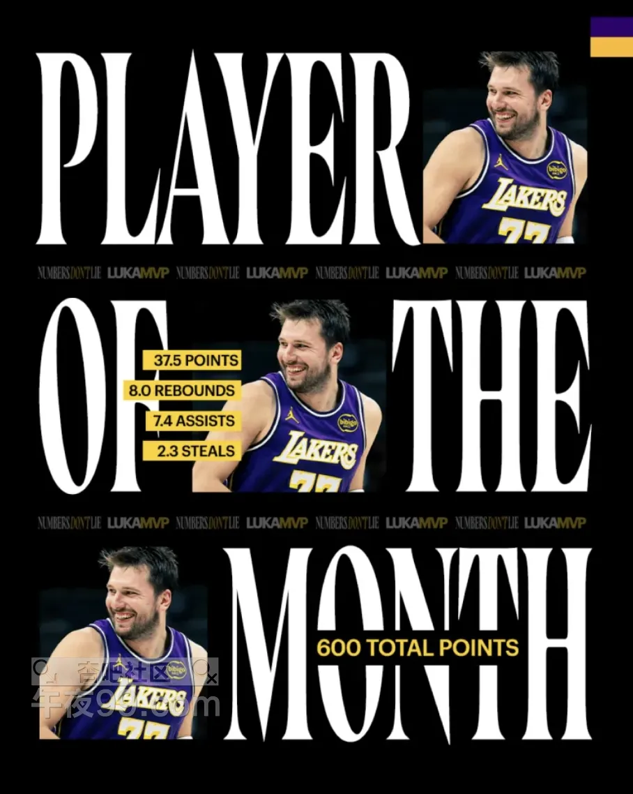 西部月最佳!湖人官媒晒东契奇数据海报:场均37.5分7.4助攻